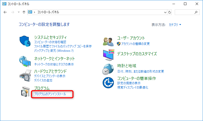 コントローパネルから[プログラムのアンインストール]を選択します。