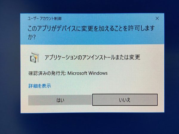 「ユーザーアカウント制御」が表示されるので、「はい」を選択します。