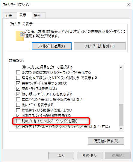 「別のプロセスでフォルダーウィンドウを開く」という設定があり、