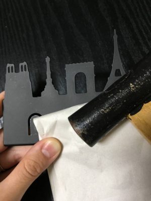 本来は壁に掛ける商品のため、フックとして金属が出っ張っている部分があります。この部分をトンカチなどで押し曲げ平らに直します。