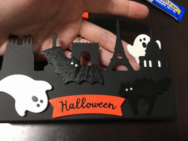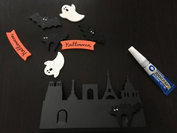 ②次に、ハロウィンモチーフを瞬間接着剤で土台に貼っていきます。