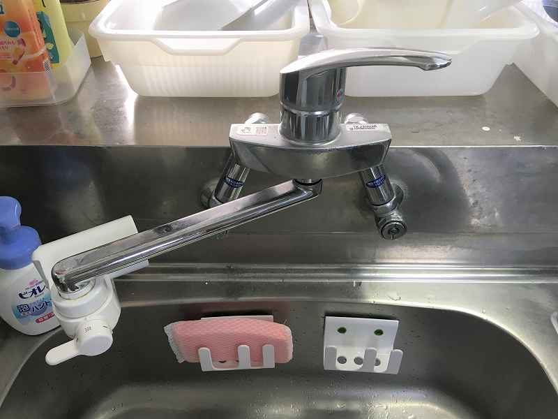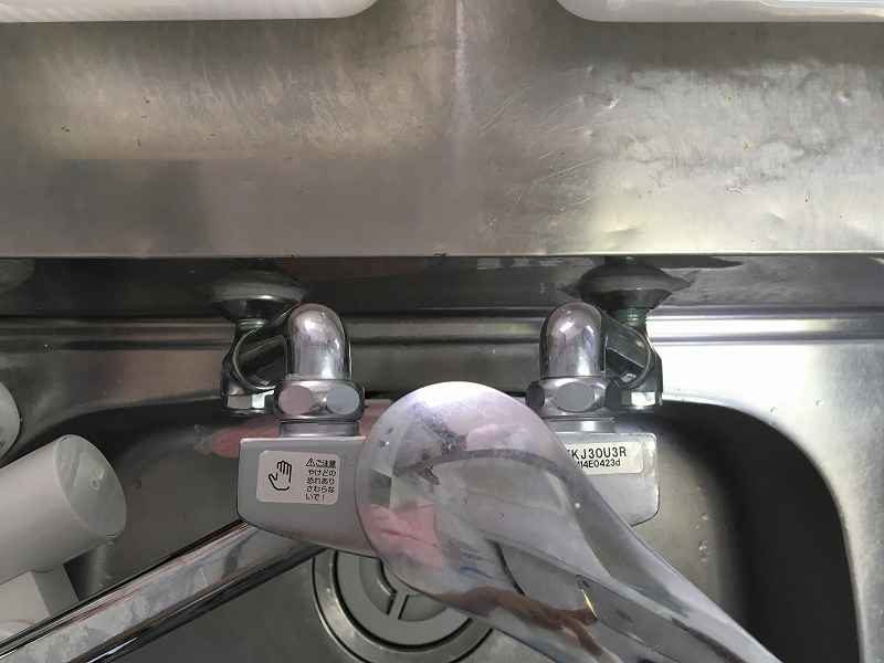 私の場合は壁付けタイプの水栓で、お湯と水に水道が分かれています。