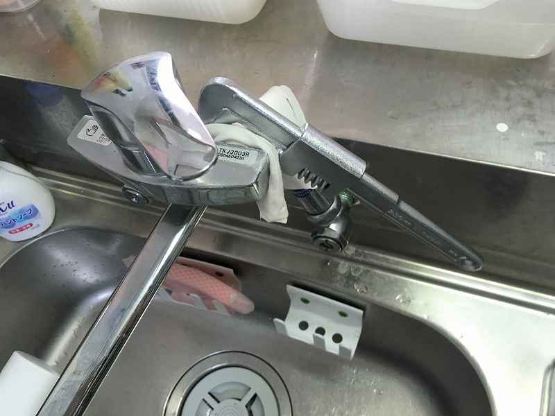 水道を止めることができたらキッチンの水栓をモーターレンチを使って取り外します。