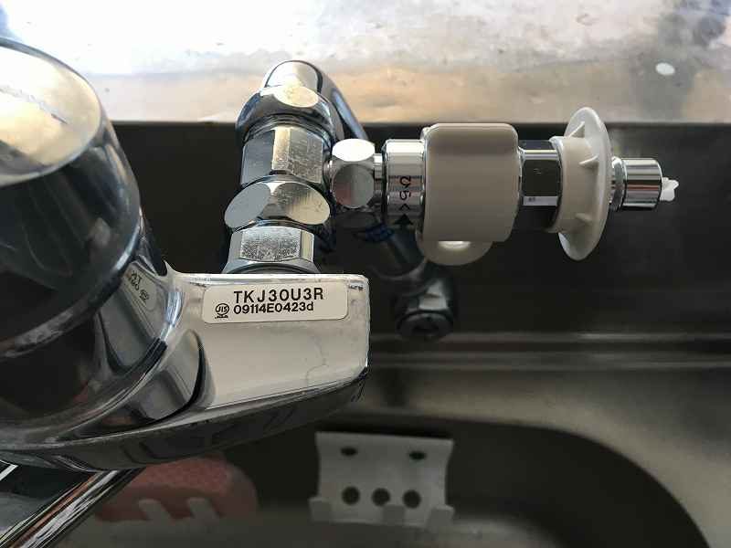 我が家の水栓は、壁付けタイプの水栓(品番:TKJ30U3R)を使っています。