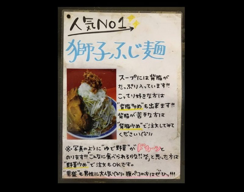 チャーシューと野菜と背油がたくさん入ったこってりの獅子ふじ麺が一番人気のラーメンになっています。