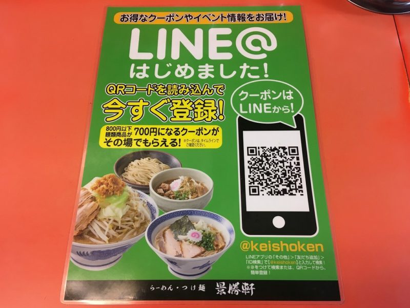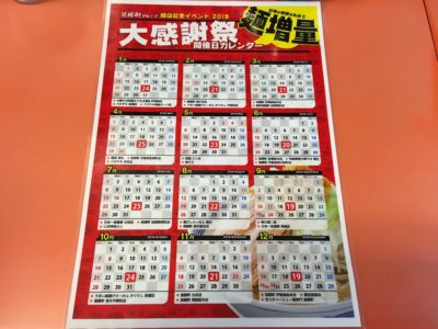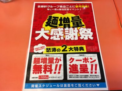 景勝軒グループの各店にて、年に一度、開店記念日にイベント日が設定されているようです。「麺の量を100g増やしてもらえるサービス」と「クーポン券をもらえるサービス」をやっているようです。