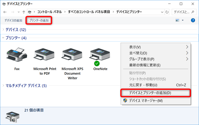 上部の「プリンターの追加」または、何もない余白の部分で右クリックして「デバイスとプリンターの追加」を選択します。