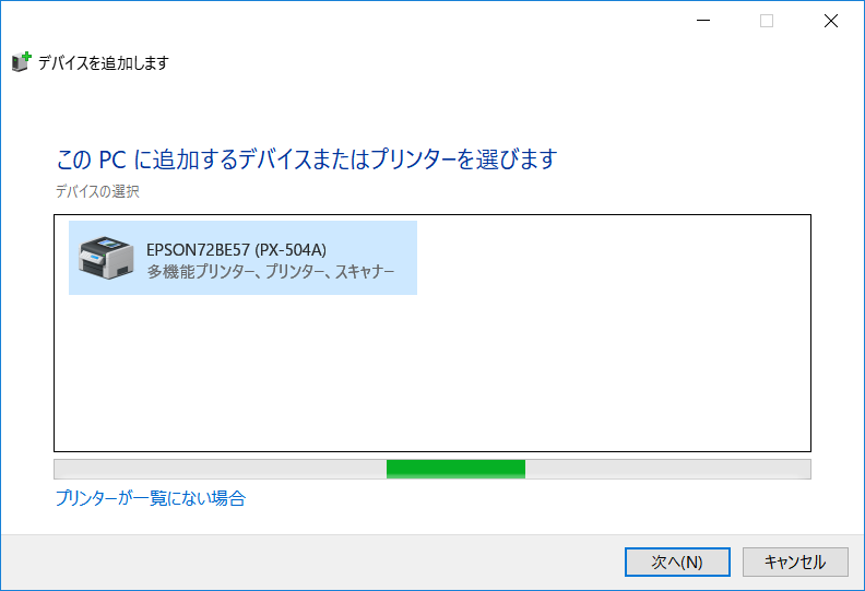 自動で対象のデバイスを探してくれるので、表示された自分の複合機やスキャンデバイスを選択して「次へ」を選択します。