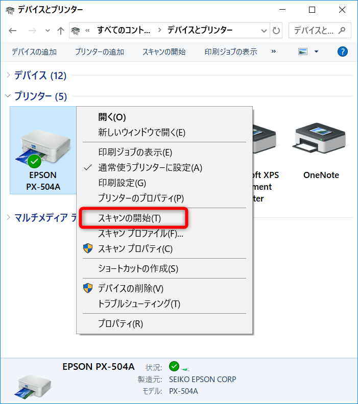 私の場合プリンタドライバを公式サイトからダウンロードして最初にインストールしたのですが、そのプリンタデバイスの場合、この「スキャンの開始」メニューが表示されませんでした。