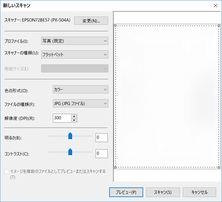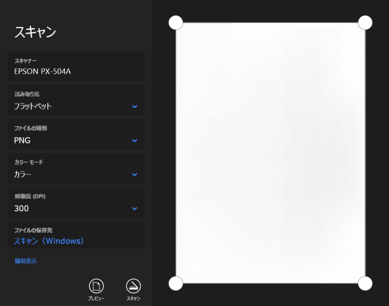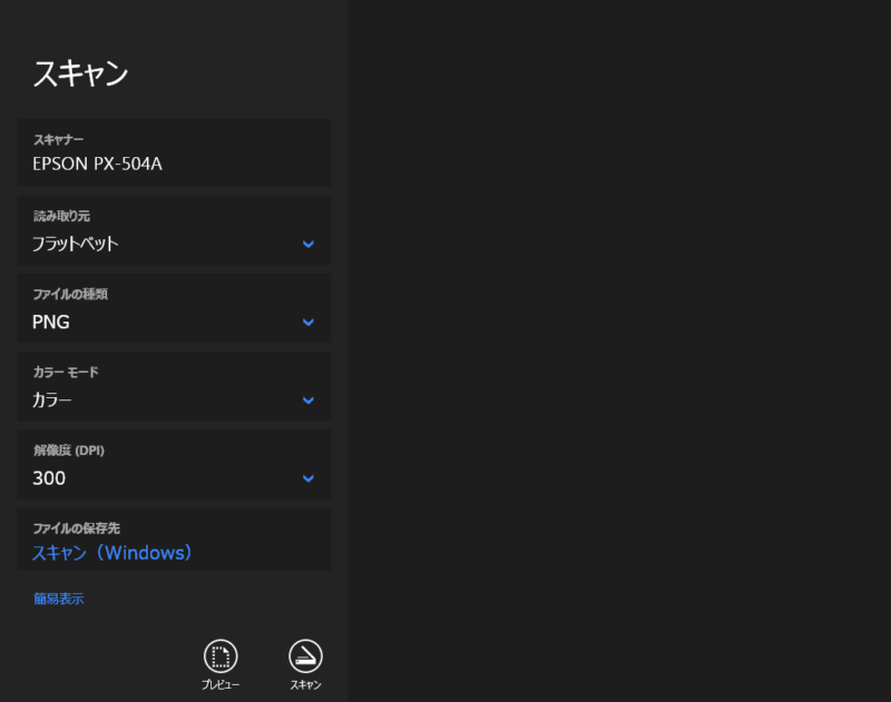 取り込み設定などが最低限になっているので「EPSON Scan」と比べてしまうと機能が少ないですが「スキャン処理」をちゃんと実行することができます。