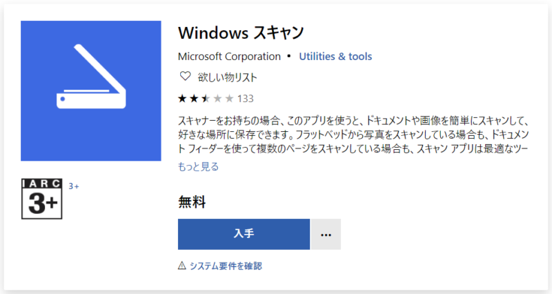 上記のリンク先から「入手」を選択してWindowsに「スキャン」ソフトをインストールしましょう。