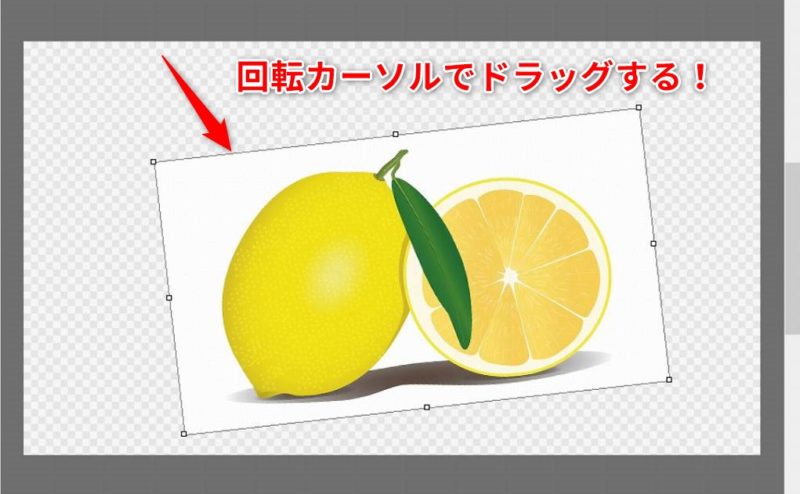 そうするとカーソルが回転マークになるので、ドラッグしてレイヤー(画像)を回転させます。