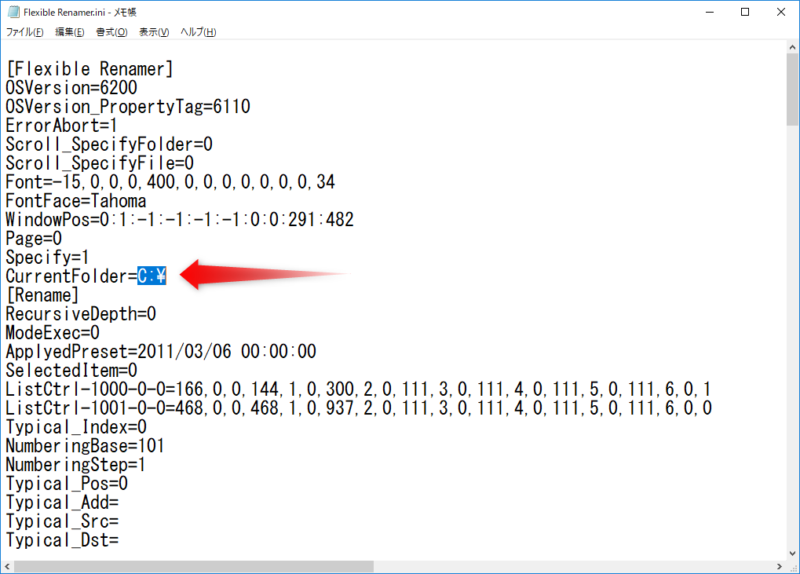 [Flexible Renamer]セクションの中の「CurrentFolder=」の「値」を変更しましょう!