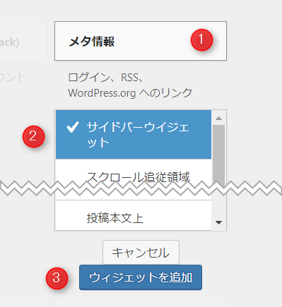 利用できるウィジェットのメタ情報項目を開き[ウィジェットを追加]をクリックすることでも、メタ情報をサイドバーウイジェットに追加することもできます。
