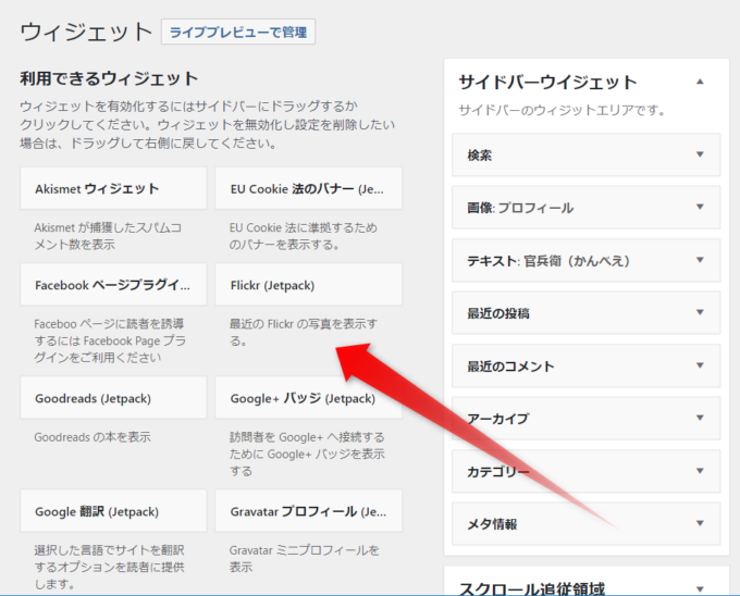 サイドバーウイジェットのメタ情報をドラッグ&ドロップしてサイドバーウィジェットから外しましょう。
