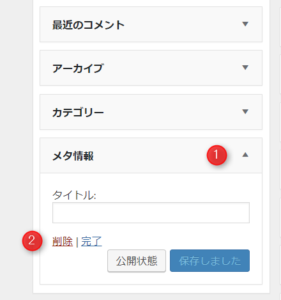 サイドバーウイジェットのメタ情報項目を開き、削除をクリックする。