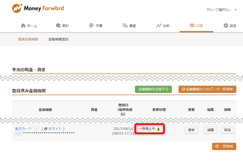 マネーフォワードで楽天カードが一時停止中と表示される!自動取得できない・・・