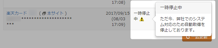 2018年8月3日時点で、楽天カードの自動取得が一時停止中となっております。