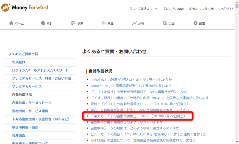 「楽天カード」の自動取得停止について(2018年7月27日発生)