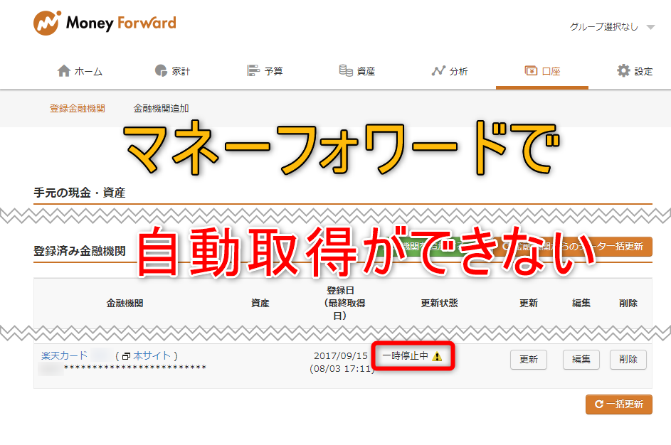 マネーフォワードで楽天カードが一時停止中と表示される!自動取得できない・・・