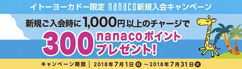nanaco新規入会キャンペーン:イトーヨーカドー全店でnanaco新規入会…1,000円チャージで300ポイントプレゼント