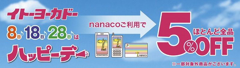 イトーヨーカドーのほとんどの商品が「5%OFF」になったり、nanacoポイントが2倍になったりお得に買い物できます。
