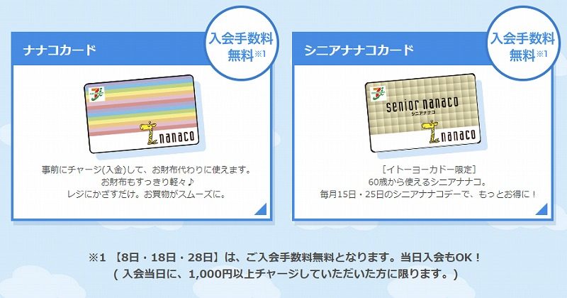 ただし、1つだけ条件があって入会当日に1,000円以上チャージが必要です。この条件を満たせばnanacoカードを無料で作ることができます。