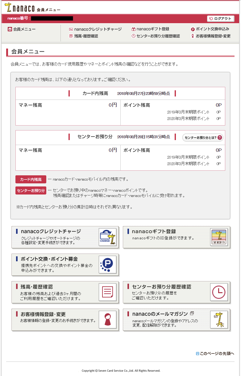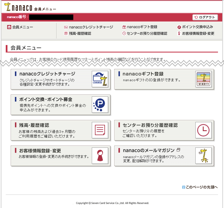 ログインするとnanacoの会員メニューが表示されます。