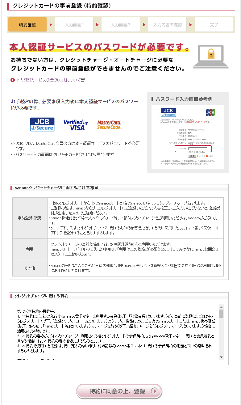クレジットカードの事前登録(特約確認)が表示されるので、 内容を確認し、[特約に同意の上、登録]を選択します。