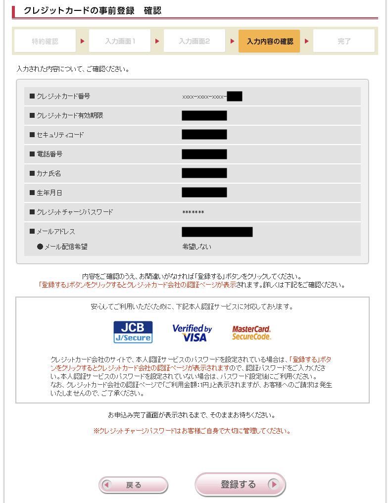 これでクレジットカードの事前登録が完了します。