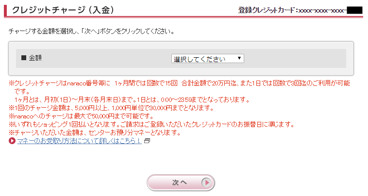 1日経ったので、 nanaco の会員メニューから「nanaco クレジットチャージ」を行いたいと思います。