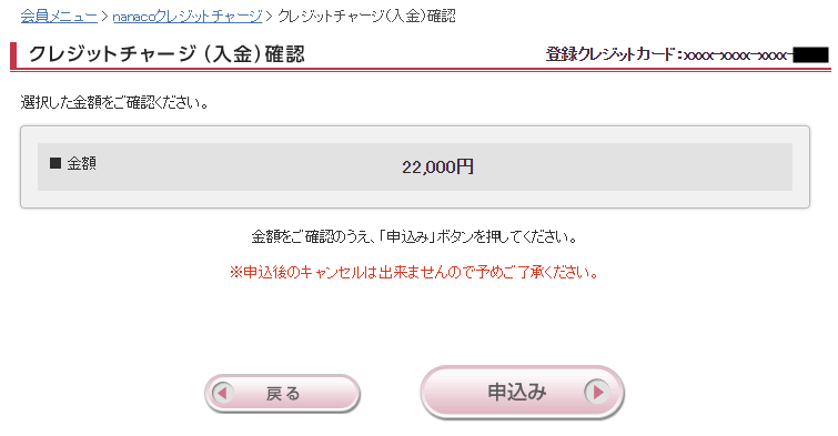 チャージする金額の確認画面が表示されます。