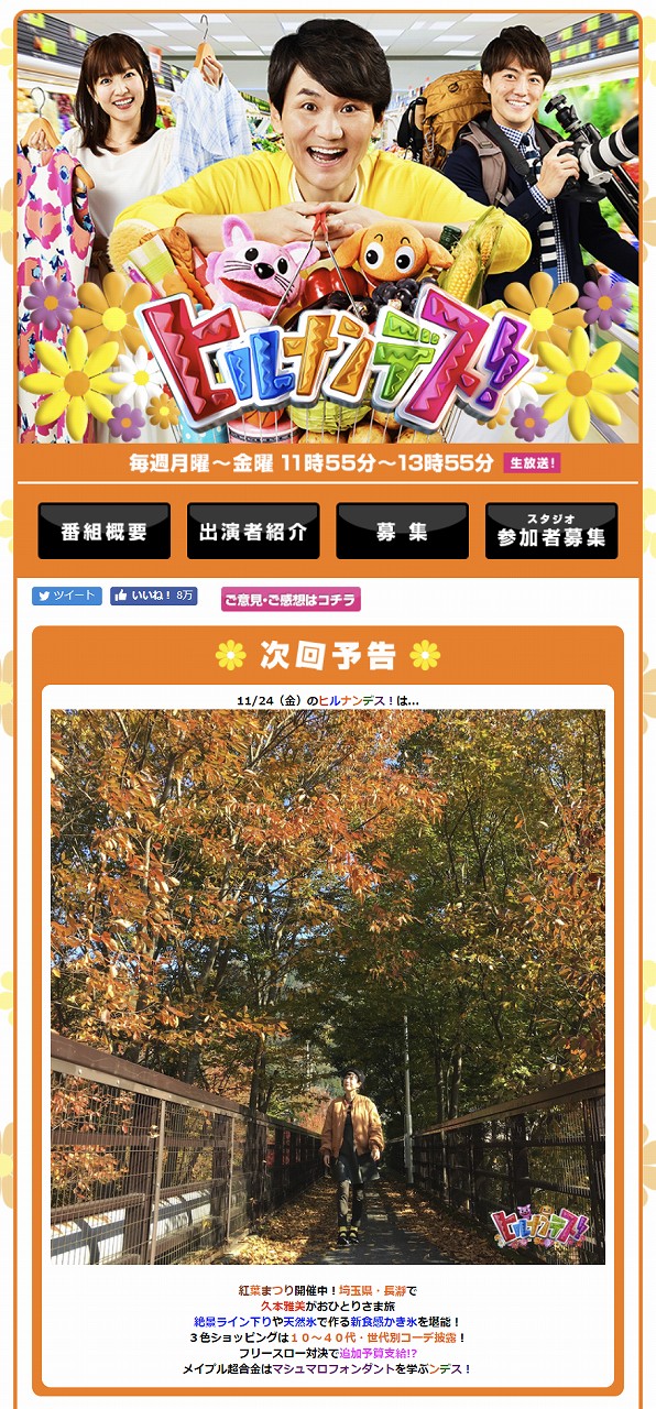 ヒルナンデス! マチャミが紅葉&地元グルメを満喫の女ひとり旅http://www.ntv.co.jp/program/detail/21864409.html