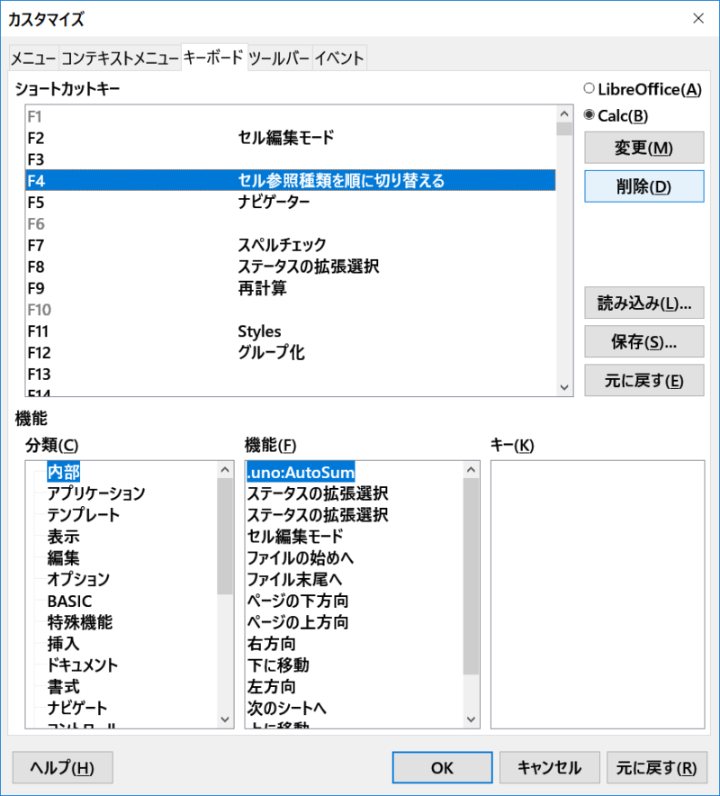 先ほどのショートカットキーの設定は「Calc」での設定でしたが、