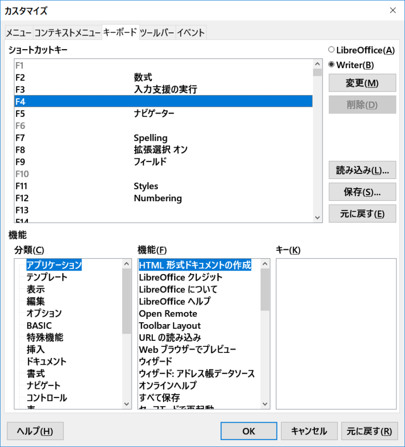 【カスタマイズ画面】で、[LibreOffice]ラジオボタンを選択して、ショートカットキーの設定を行えば「Calc」だけではなく、Libre Office(OpenOffice)全体でショートカットキーを設定することができます。