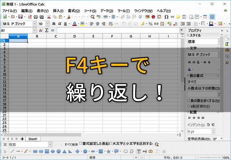 無料で使えるオフィスソフト「リブレオフィス」「オープンオフィス」で、F4キーを押して「繰り返す」操作を行いたい場合のまとめです。